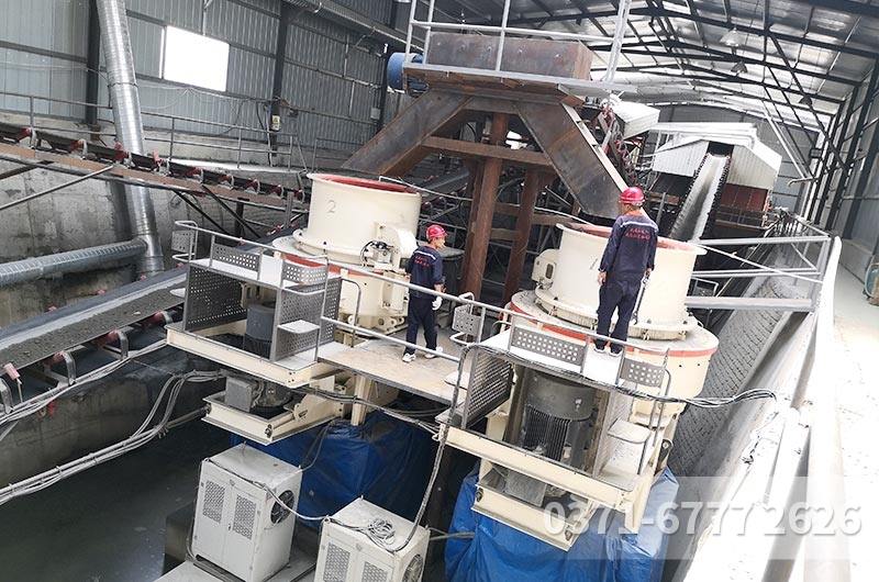 物料由进料斗进入破碎机,经分料器将物料分成两部分,一部分由分料器中间进入高速旋转的叶轮中,在叶轮内被迅速加速,其加速度可达数百倍重力加速度,然后以60-70米/秒的速度从叶轮三个均布的流道内抛射出去,首先同由分料器四周自收落下的一部分物料冲击破碎,然后一起冲击到涡支腔内物料衬层上,被物料衬层反弹,斜向上冲击到涡动腔的顶部,又改变其运动方向,偏转向下运动,从叶轮流道发射出来的物料形成连续的物料幕。