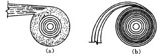 给矿口的大小对处理能力、分离粒度以及分级效率均有一定影响。其直径常与旋流器直径呈一定比例,大多dc=(0.08-0.25)D。给矿口的横断面形状以矩形为好。而纵断面常为图1(a)所示的切线形。由于这种进料方式易使矿浆在进入旋流器时与器壁冲击产生局部旋涡影响分级效率。因此出现了如图1(b)的渐开线形及其他型式的给矿管。