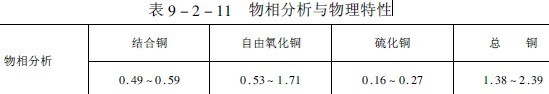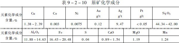 该矿属于石英闪长斑岩与石灰系灰岩接触交代矽卡岩铜矿床。矿石呈土状,氧化程度较深。由于成岩阶段次生富集作用,铜液扩散推移过程中与硅、铁和铝的盐类及其氧化物形成结合性氧化铜,覆盖于表面及间夹于孔雀石类型矿石中。含铜矿物以孔雀石为主,有少量蓝铜矿、硅孔雀石和水胆矾等。铁的矿石主要为褐铁矿,磁铁矿和亦铁矿次之。脉石除铁质粘土外,还有石英、云母、石榴子石、角闪石、蛇纹石、绿泥石和方解石等。原矿中铁质粘土含量很高,-200目高达48%,矿石含水27.1%,矿石大块300毫米左右。原矿物质组成列于表9-2-10和表9-2-11。