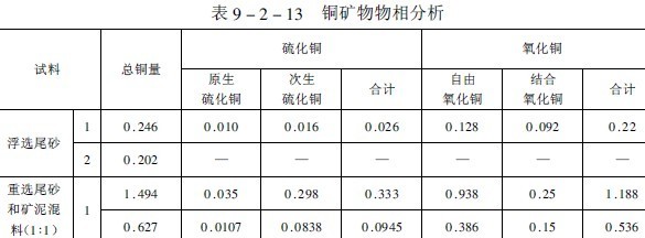 该矿含铜尾砂的特点是:除铜外伴生有稀有金属,矿石呈酸性,但脉石碳酸盐含量较高,粒度细(1毫米),呈粘性,渗滤性能差。尾砂的品位及铜矿物相组成列于表9-2-13。