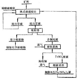 水口山矿务局柏坊铜矿,地表堆积着大量含铜和稀有金属的贫矿和尾矿。近年来,在中国科学院微生物研究所的帮助和指导下,发展了用硫酸-细菌浸出回收尾矿中的铜和稀有金属的研究工作,并于1972年正式投入生产。几年来的生产实践证明,硫酸-细菌浸出贫矿石的工艺,可以综合浸出矿石中的铜和稀有金属,回收率较高、操作简便、设备少、成本低,是一个变废为宝、化害为利、综合利用矿产资源的有效途径。