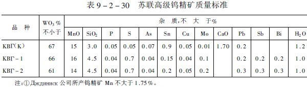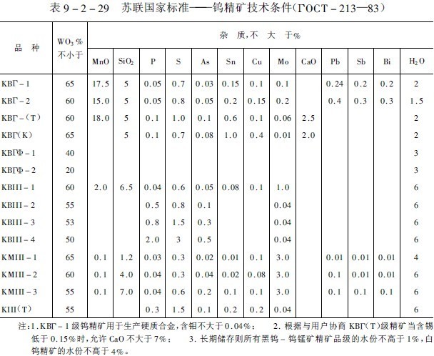 表9-2-29及表9-2-30为苏联国家钨精矿产品标准,表9-1-31为国外良好钨精矿产品标准。