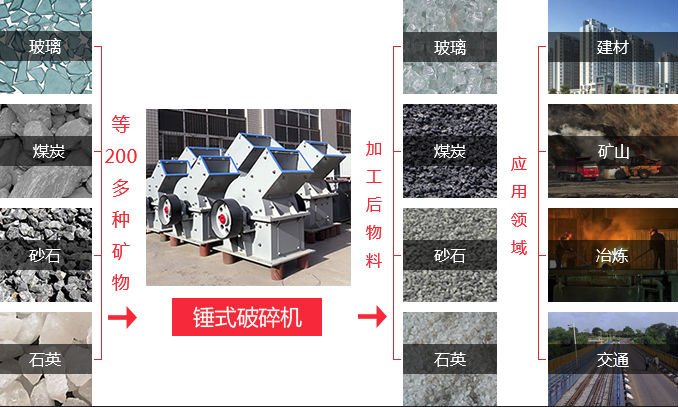 在实际生活中,人们常用小锤破来加工石灰石、花岗岩、铁矿石、玻璃和大理石等物料的破碎,其成品也被广泛应用于建材、冶炼、道路、建筑、交通等诸多行业领域中。