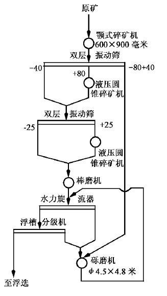 选机,目的是尽早地丢弃尾矿,这样可以大量节省磨矿费用。另外,在回路中应用了弧形筛和敲击细筛,前者用来分级,后者用作选别。例:芬兰奥托昆普公司克列蒂铜矿两段砾磨流程如图6所示。原矿经三段破碎后给入第一段砾磨机进行粗磨,粗磨的产物再进第二段砾磨机细磨。第一段砾磨机的砾介从粗碎产物中筛出,第二段砾磨的砾介从中碎产物中筛出。若第二段砾磨机的砾介消耗量大,所用砾介可从粗碎产物中筛出部分加以补充。