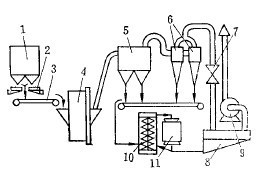 细小的物料继续进入旋风分离器7,进行第二次分级,这时绝大部分细小物料都沉降。已在沉降箱和旋风分离器中沉降的物料靠锁气器8间断排出,贮存在粉矿仓9中,以便进行干式磁选。未被收集的微细物料在闭路风路系统中循环。闭路系统中主风机出口到磨机入口段,其静压值有部分为正压,粉尘易从这一段逸出。为使主风路系统在负压条件下工作,防止灰尘溢入室内漫延,减少微细物料和水分在主风路系统中造成恶性循环,设有副风路系统。副风路系统设在主风机与自磨机之间,由文氏管11洗涤器12及辅风机13组成。经副凤路系统净化后的气流排于大气中。