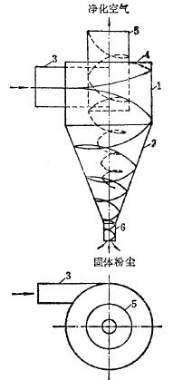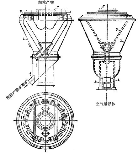 另一种结构近于水力旋流器的风力旋流器,为提高分级效率,下部还供入上升气流。通过式离心分级器(见图3-4-8),主要用于与干式磨机闭路工作。设备主要由外锥1和内锥2组成,上部装有导向叶片5,使由内外锥之间上来的气流呈切线进入内锥。磨机产物与气流一起从底部管道中以大约18-20米/秒的速度向上供入,进入内外锥之间的环形空间后,因过流断面变大,速度降到4-6米/秒,于是,粗的矿粒落下,由管4中排出,返回磨机再磨。其他矿粒被气流带着往上行,经叶片5,呈切线进入内锥,产生回旋运动。在惯性离心力作用下,较粗的矿粒被抛到内锥壁上,然后下落,由排矿管6排出。这种产物或作为产品,或者返回磨机,视情况而定。细矿粒随气流从顶部管道中排出,集尘器中收集,为细粒产物。